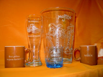 Zvláštní metodou pískování jsme schopni zajistit vaši reklamu nejen do skleněných předmětů... Vše realizováno technologií Santander Turbo. Dále gravírujeme a ryjeme cokoliv a kamkoliv...